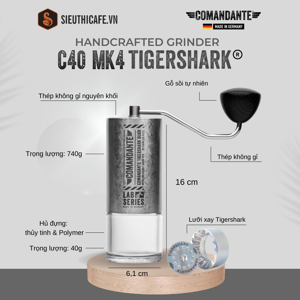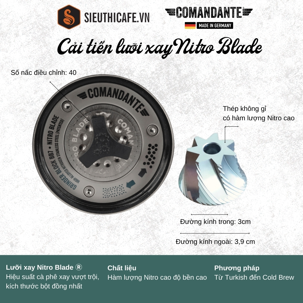 Comandante C40 Lab Series Nitro Blade® không chạy theo xu hướng hay cá tính cực đoan. Thay vào đó, nó đại diện cho sự cân bằng, ổn định và trung thực với hạt cà phê.